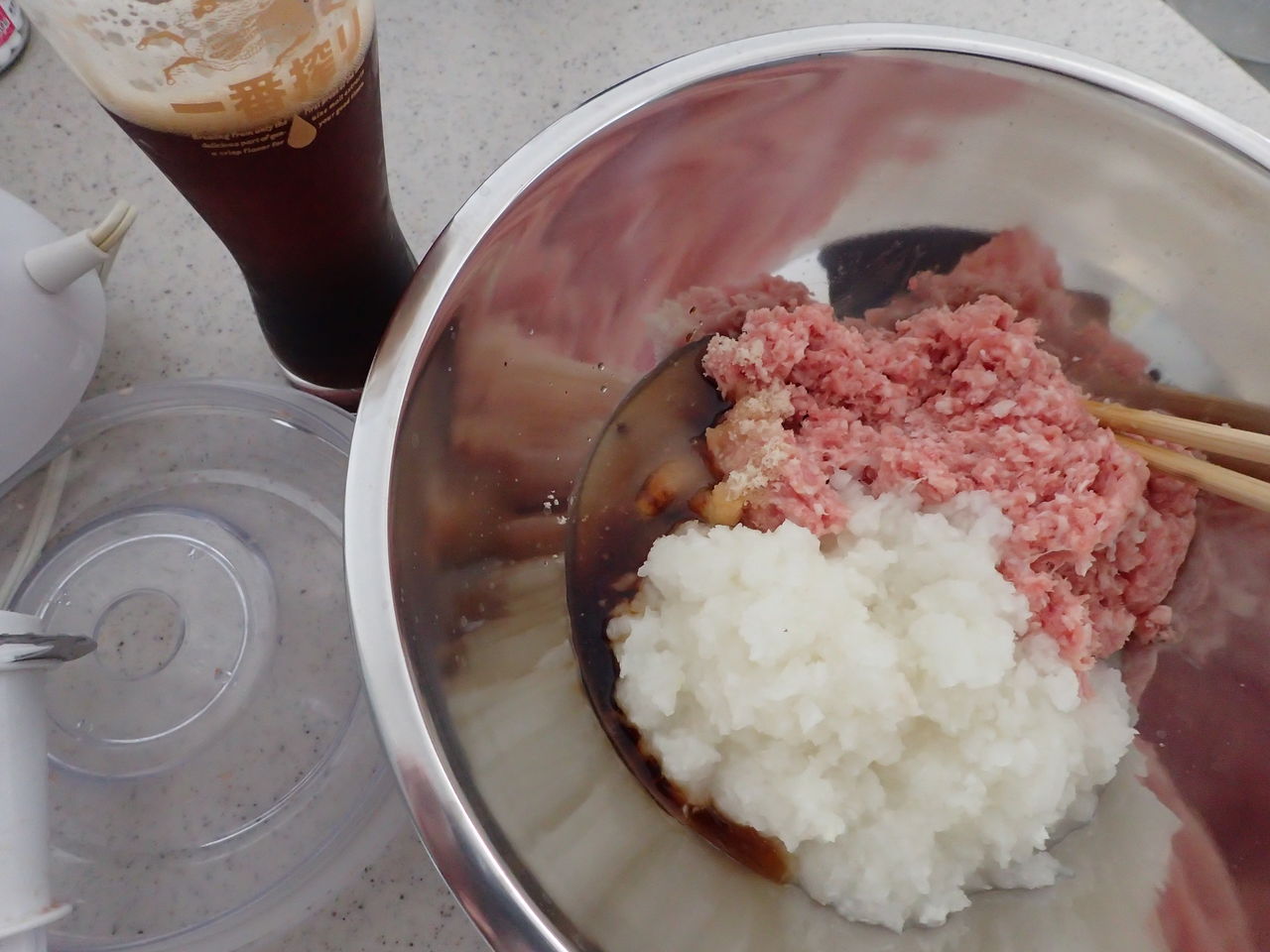 恒例のフープロでお肉と玉ねぎを一気に細かくして、味付けしたら