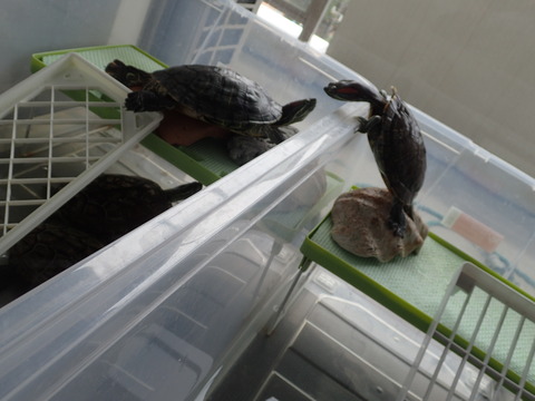 以前お伝えしたように「噛みつきペア」と「噛まれるペア」で住まい分けしているのですが、壁を乗り越える技を完璧にマスターした1番大きいミドリガメのドリちゃんが両方のお家を行ったり来たり![]()