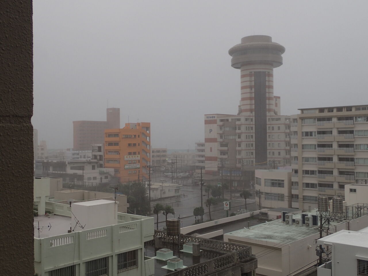 今朝の時点で沖縄本島にかなり近づき中心付近の最大風速は50m、最大瞬間風速は70mの突風と激しい横殴りの雨が降っています![]()