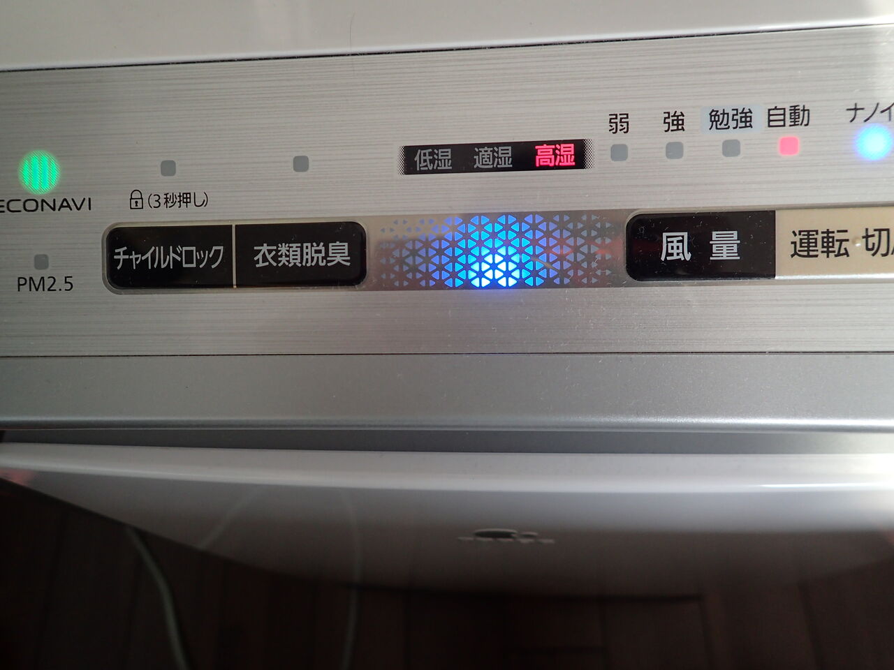 空気清浄機の湿度センサーが「高湿」を示しています。湿度が高い時はエアコンを使って除湿します。