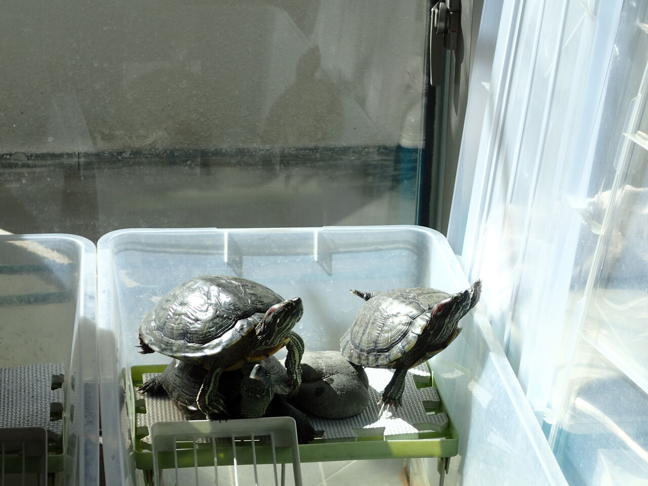 日差しがないと意気消沈のカメちゃん達、今朝は日光浴の場所取り争い![]()
