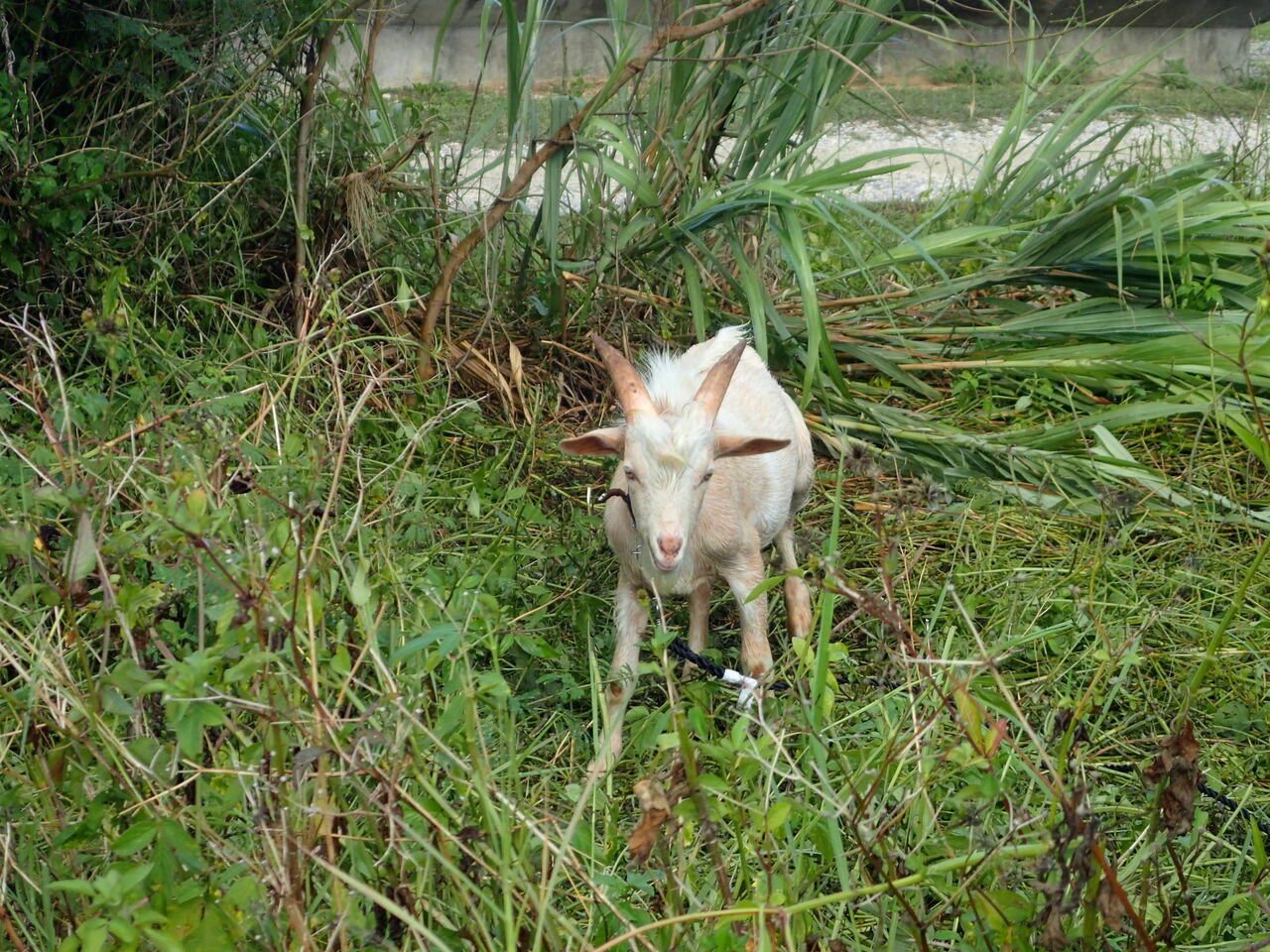 誰もいない道をビーチに向かって歩いていると、民家の横の草むらから「めぇ~~~~っ」