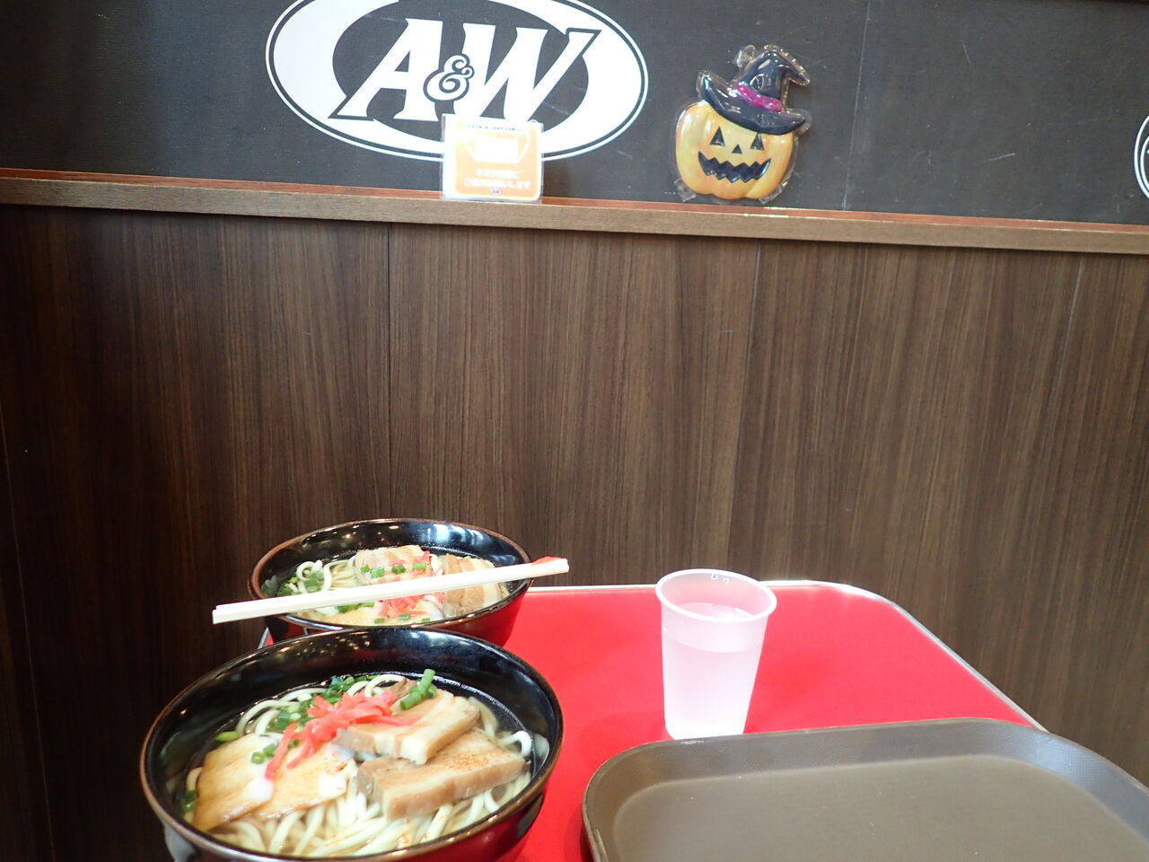 このあと起こる事態も知らずにハンバーガーショップで宮古そばをすする2人。その後、ご存知のとおり大幅な遅延に巻き込まれ