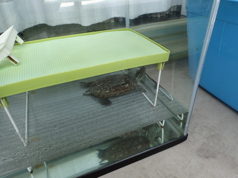 です。少し前に同じゼニガメのグーちゃんに尻尾をかじられたマーちゃんが、今朝水槽の中でバタバタ暴れていました![]()