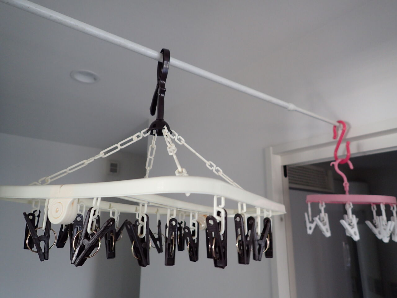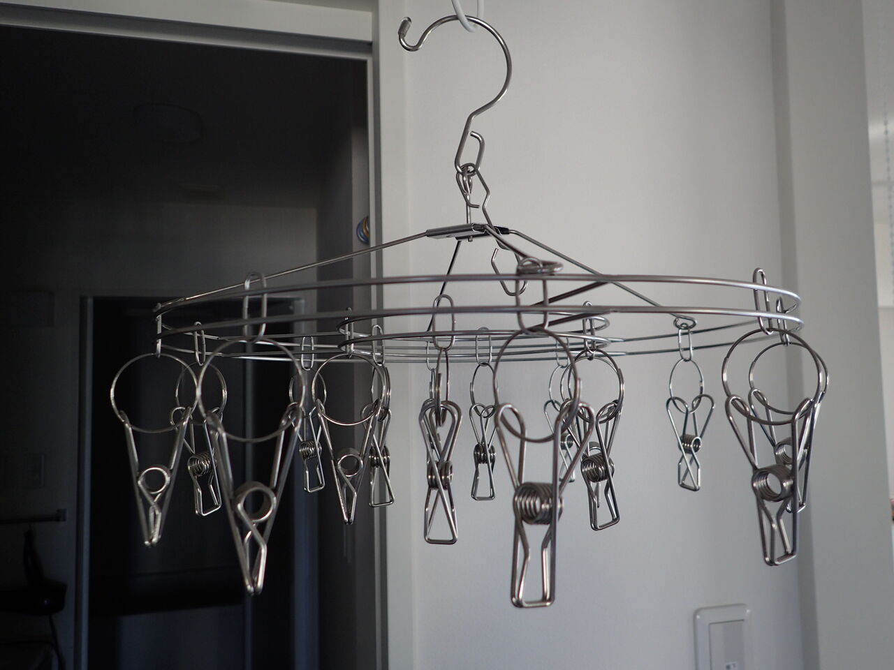 使ってみると、ちょうどいい強さの16個のピンチに靴下、マスク、ハンカチ、下着などをバランスよく干すことが出来てなかなか優秀