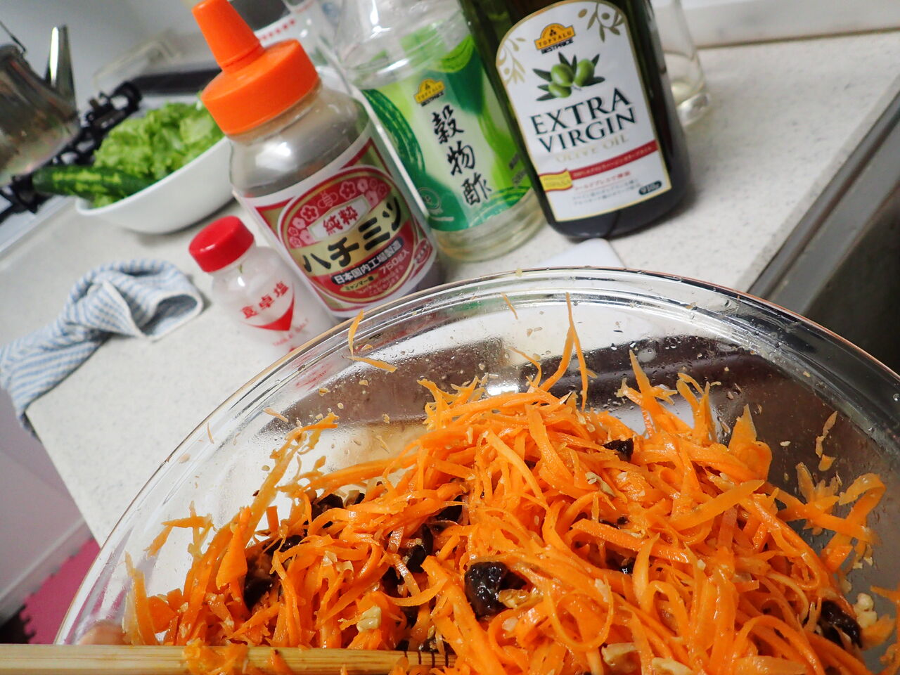 しりしりしたにんじんをオリーブオイルとたっぷりのお酢で和えて、はちみつと塩コショウで味を調えるだけ![]()
