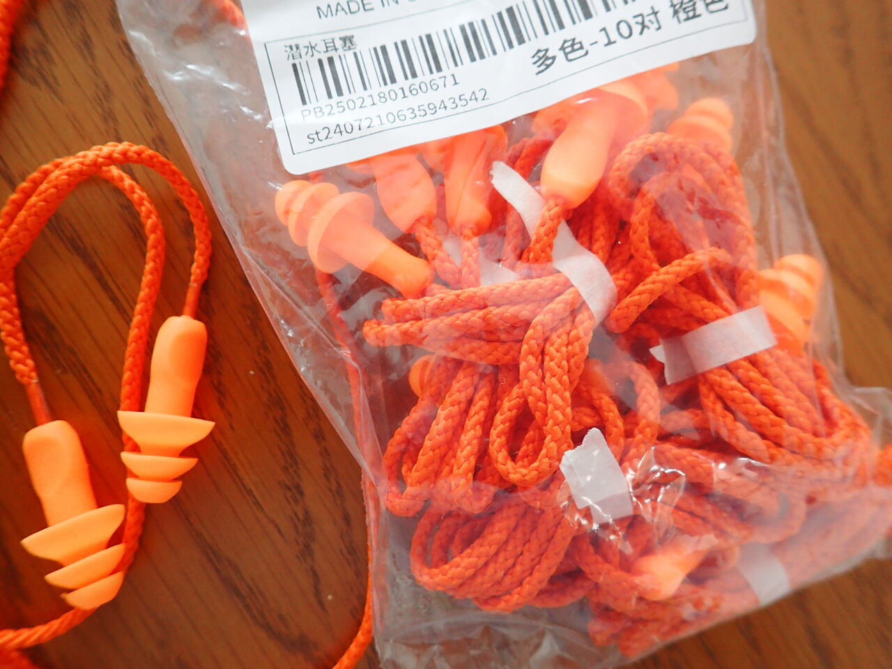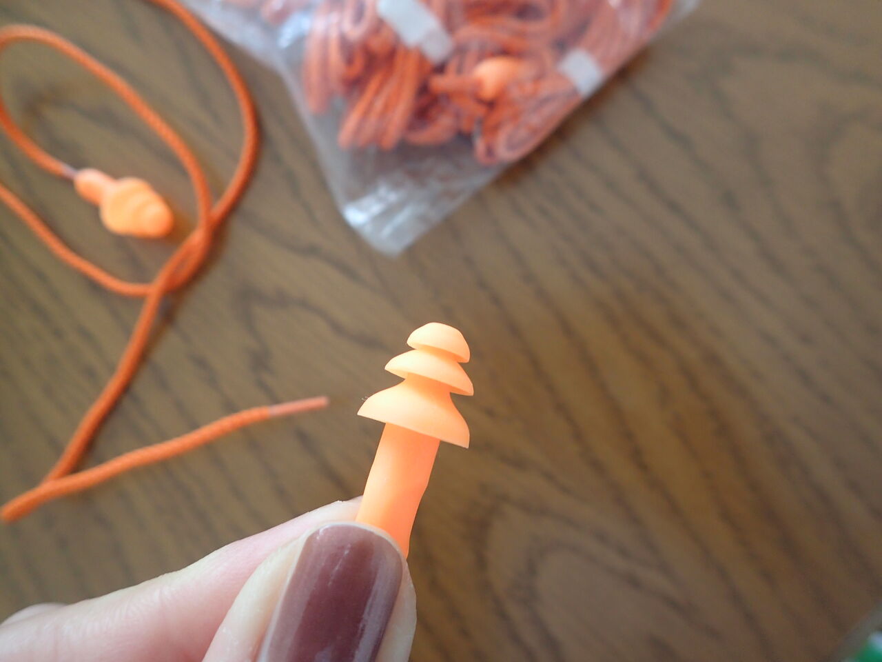 まずは紐付きのまま両耳使ってみました。耳から抜け落ちることもなく耳奥に水が入り込まないので効果抜群