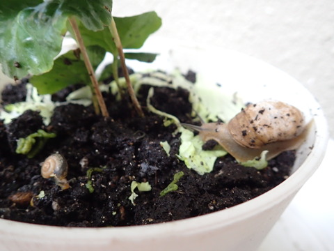 です。玄関脇のポットで飼っているカタツムリちゃん