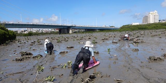 ・干潟の清掃活動やマングローブの稚樹抜きといった保全活動