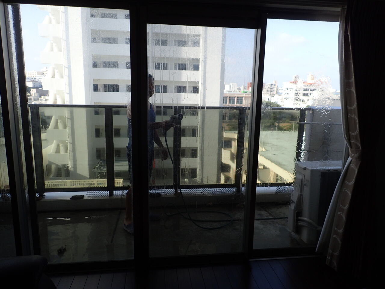 ベランダを片付けて外れてしまったネットを元通りに修復。潮でベタベタ、真っ白けになってしまった窓はジェットノズルでブシューっと洗浄してピッカピカ![]()