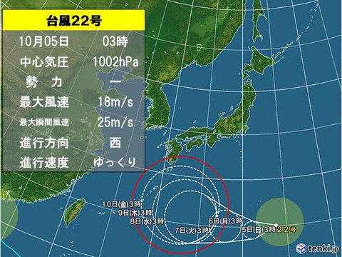 今のところ中心気圧は1002hPa、中心付近の最大風速は18m、最大瞬間風速は25mでゆっくりとした動き。ですが今後徐々に勢力を拡大して、今週水曜日8日からは沖縄近海にも波の影響が出始めそうです。