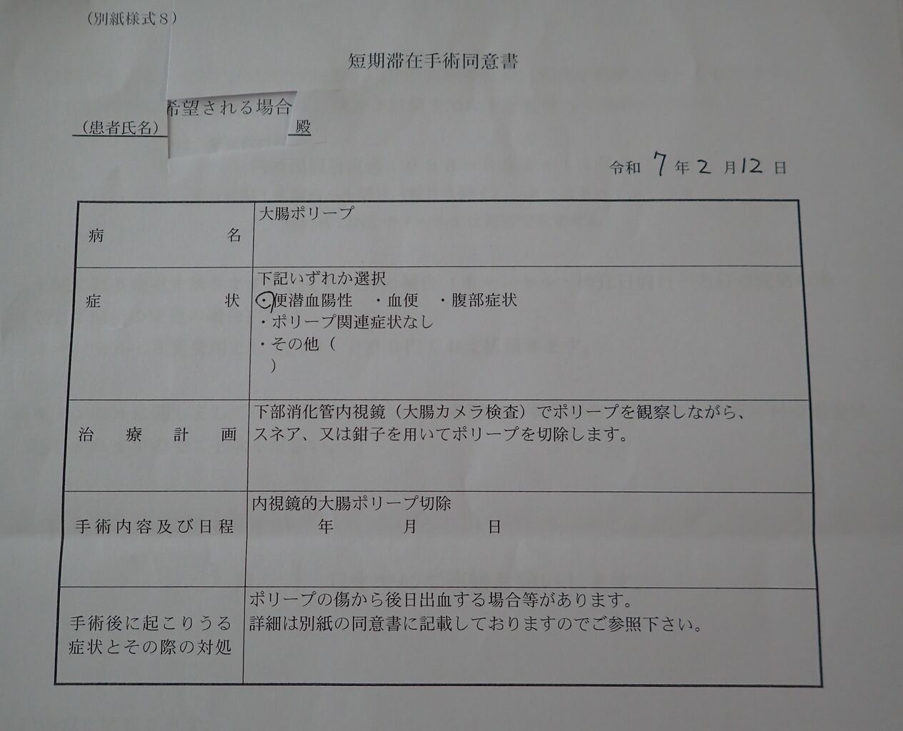 大腸内視鏡検査にあたっては次の書類にサインします。