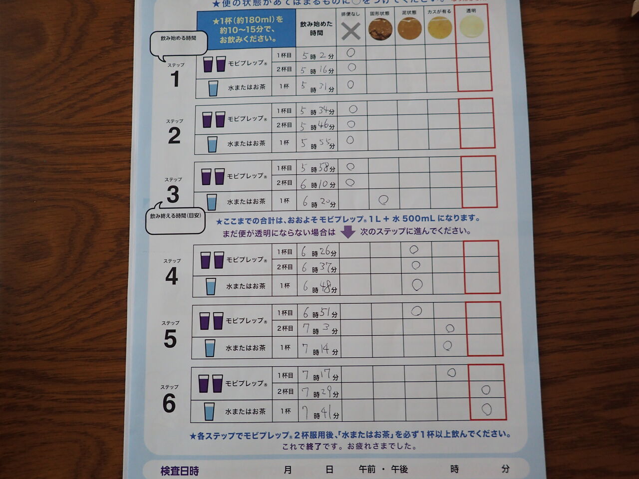 表に従ってモピレップをコップ2杯(1杯を10-15分)飲んで水を1杯、これを繰り返していきます。