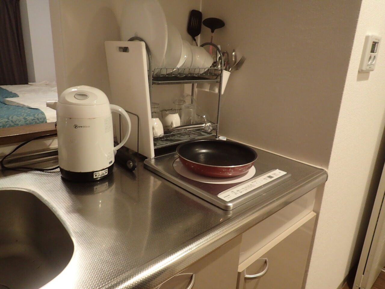 各部屋にミニキッチンがあり鍋や食器が置いてあります。