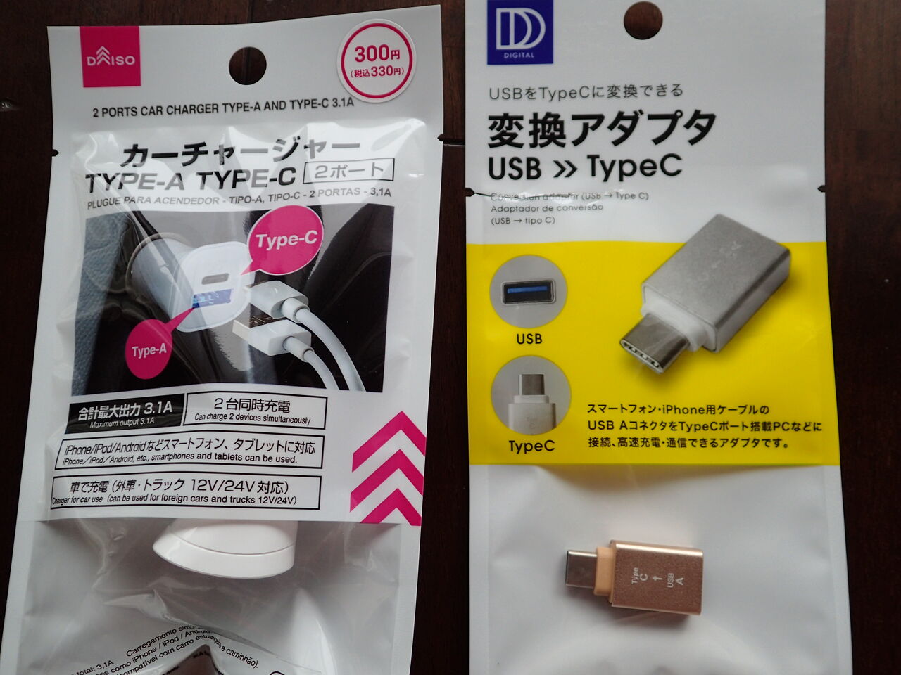シガーソケットに差し込むカーチャージャーとUSBポート⇒Type-Cの変換アダプタ