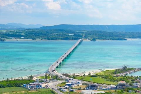全長1,960mの古宇利(こうり)大橋は本島で一番長い橋です。エメラルドグリーンの海上に真っすぐに延びる橋が美しく、よく晴れた日には息をのむほど美しい“青の絶景”が広がります。