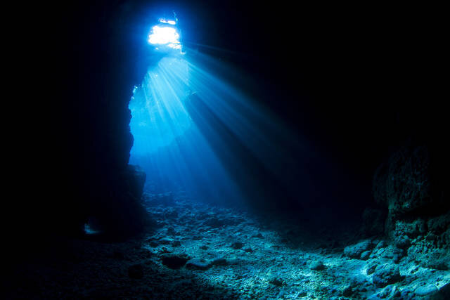 ダイビングでは有名なスポットの一つ、真栄田岬にある「青の洞窟」。海水の浸食によってできた洞窟に太陽の光が差し込むと青く輝く神秘的な感動を覚えます。