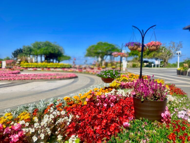 海洋博公園内が約30万株の草花で彩られます。「咲き誇る花の宝石箱」をテーマに、色鮮やかな各種草花と立体的に仕立てた模様花壇の展示が見ものです。