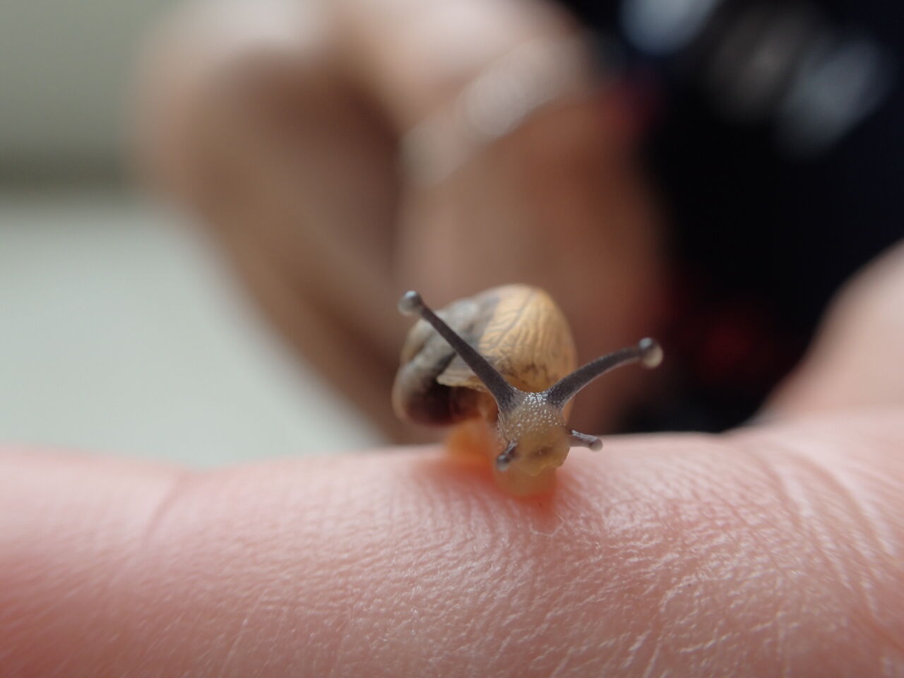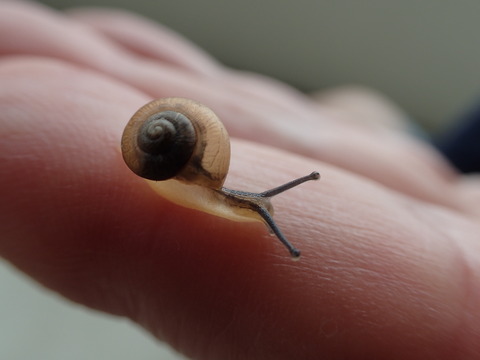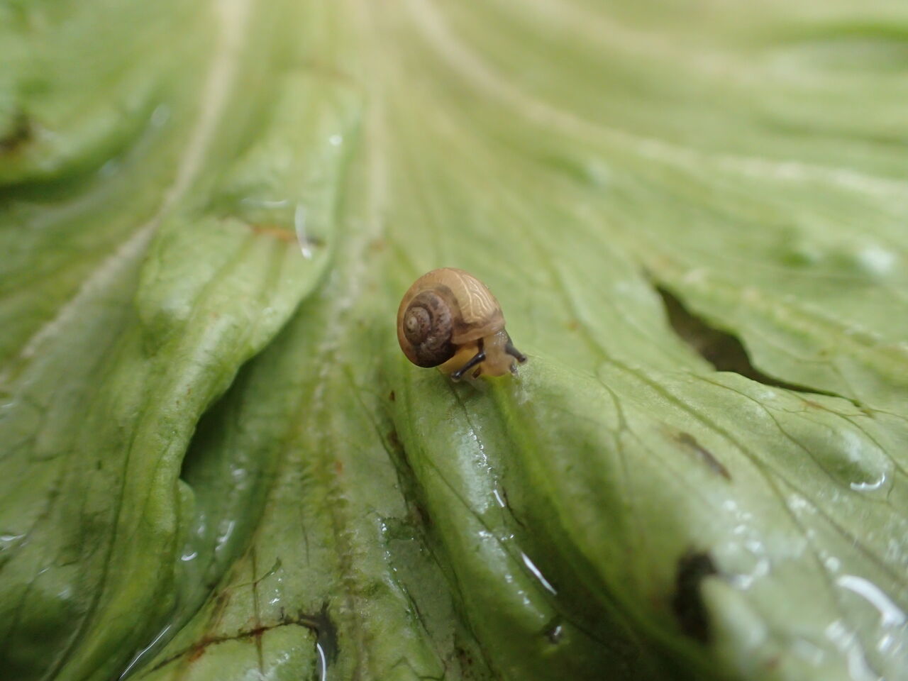 がベランダに連れて行って葉っぱの上に。雨続きでうんざりするけどカタツムリさんにとっては嬉しい季節なんですよね。