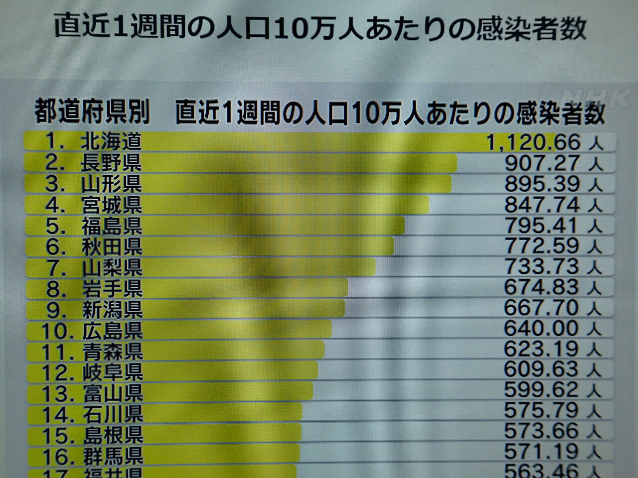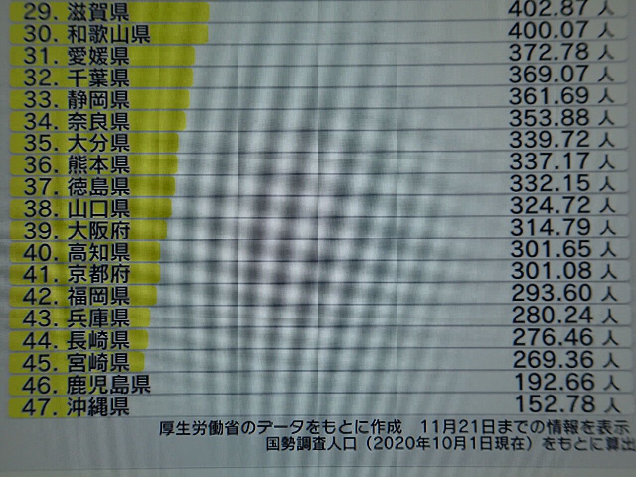 九州勢も下の方に集中しています。不思議ですねー、まぁ発表される数字の信憑性はわかりませんけど。ただ単に検査数が減ったということかもしれないし