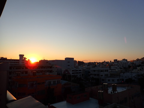 今朝7時20分、ビルの合間から朝日が昇ってきました。