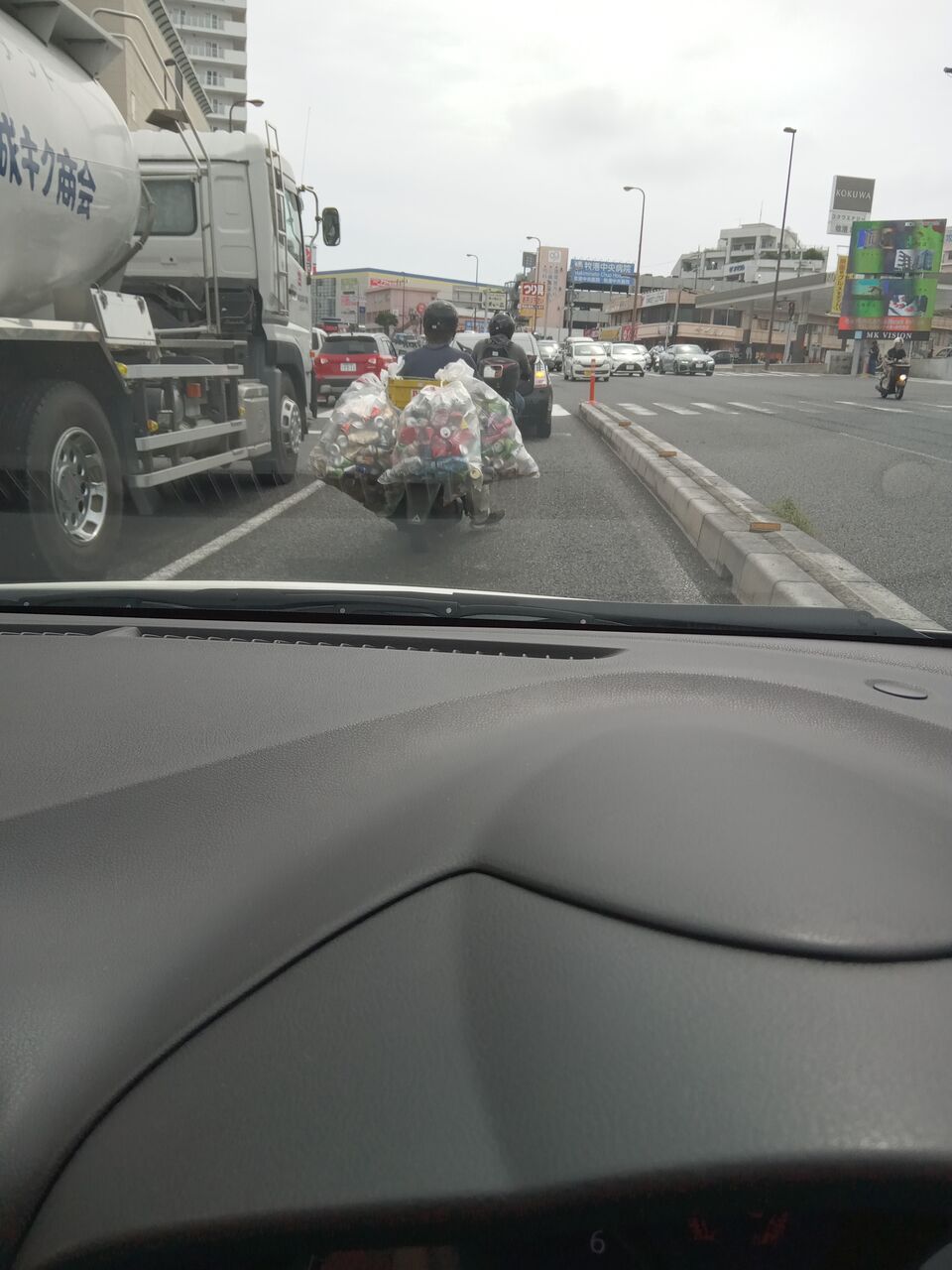 その運ぶ量が尋常ではなく、空き缶の入った大きな袋を前に横に後ろにと4~5袋ぶら下げて運ぶのです。最近は見慣れてしまいましたが初めて見たときはとても驚きました![]()