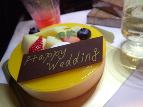 「ご結婚記念日おめでとうございます。ささやかですがケーキをお二つご用意させていただいております」