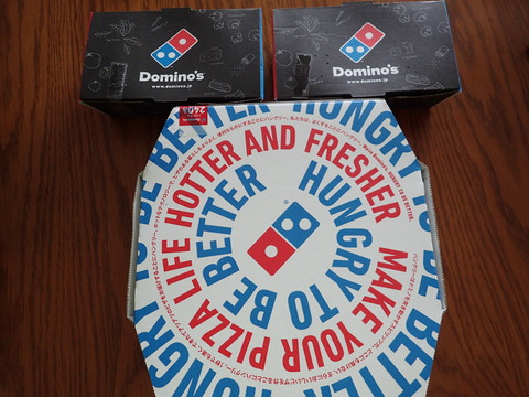 ドミノピザ、「持ち帰りは半額」ということで、 即持ち帰りを決断。家から車で10分、あらかじめネット注文したピザを受け取って帰ってきました。