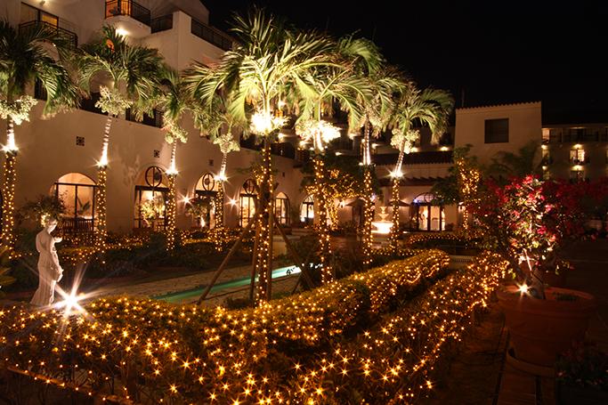 トロピカルな雰囲気のガーデンプールサイドエリアや玄関など、ホテル敷地内はムード満点のイルミネーションで彩られます。