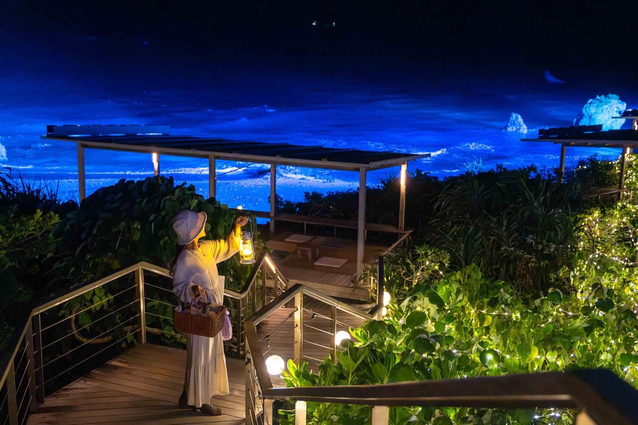 夜の海辺をライトアップして、満天の星の下に輝く青い海と、白砂のビーチが浮かび上がる幻想的な世界が楽しめます。