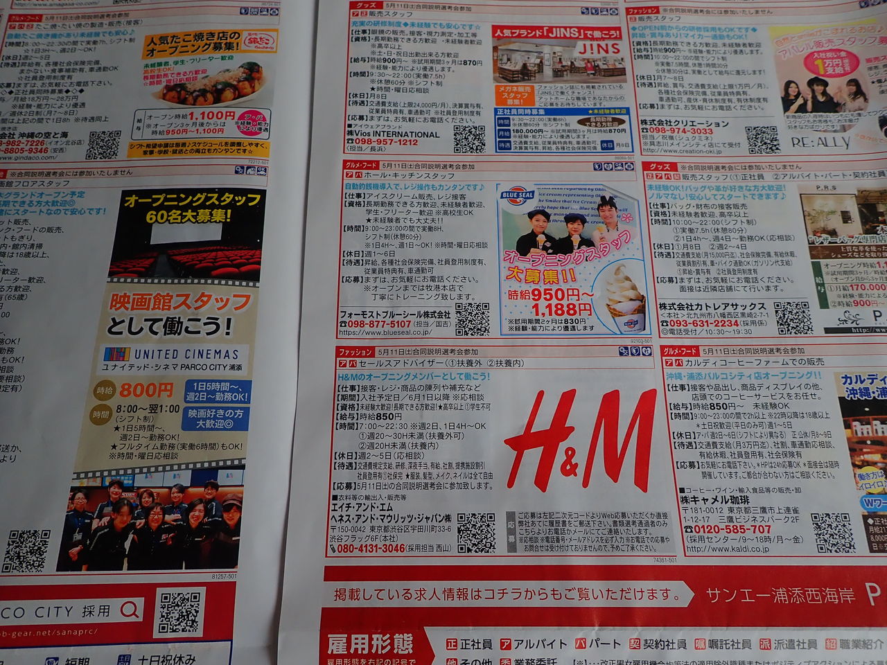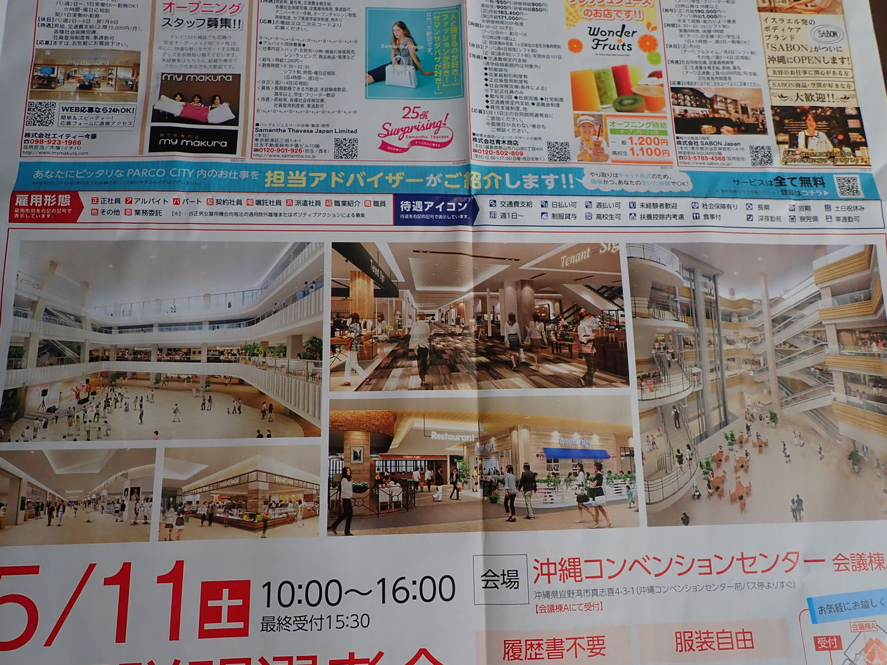 そんな中、去年から建設中でオープン間近の大型商業施設「サンエー浦添西海岸PARCO CITY」。ライカムを抜いて沖縄最大のショッピングモールとなりますが、当然店舗数もかなりの数でスタッフ集めに躍起のもよう。
