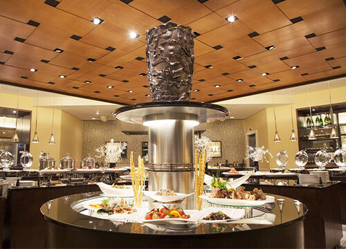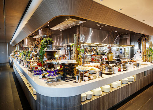 開放的でライブ感のあるオープンキッチンの賑わいと、主役級料理を豊富に揃えたブッフェスタイル。