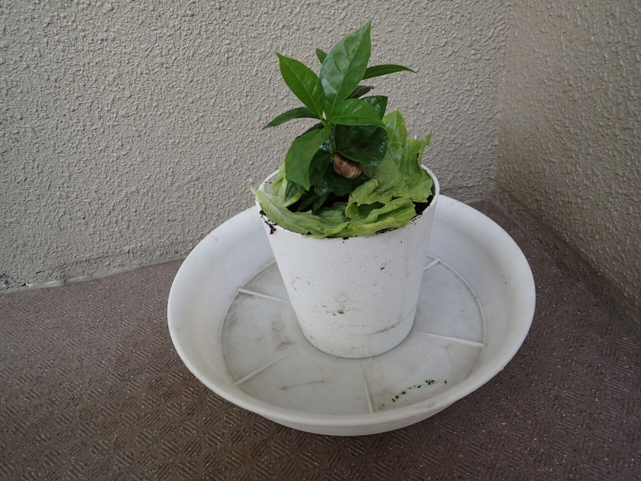 でもイヌマキの木に住んでいたカタツムリのカタちゃんのためにそのままにしてあったのですが(過去blog)ここ最近カタちゃんの姿が見えず、好物のレタスを食べている形跡もなく