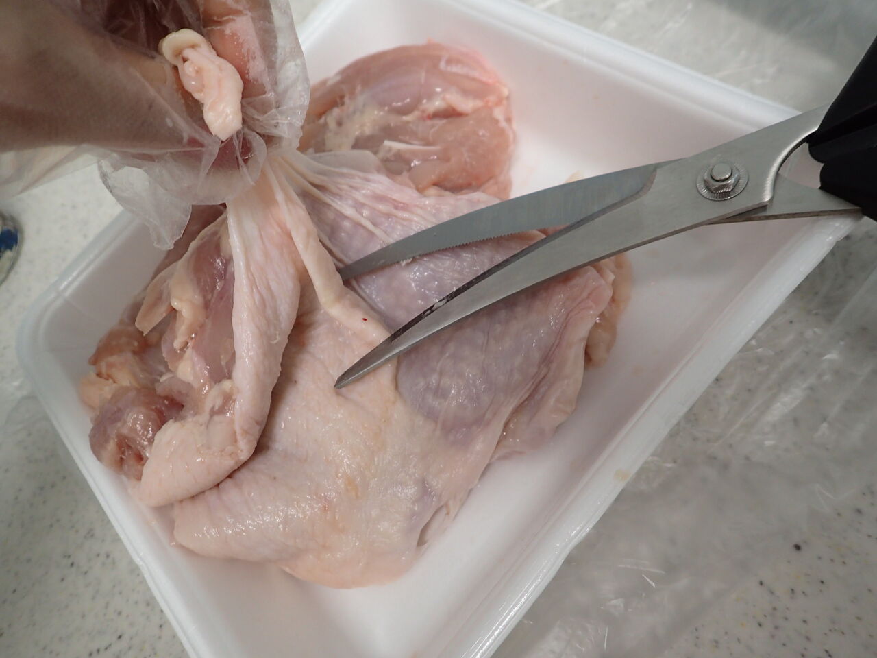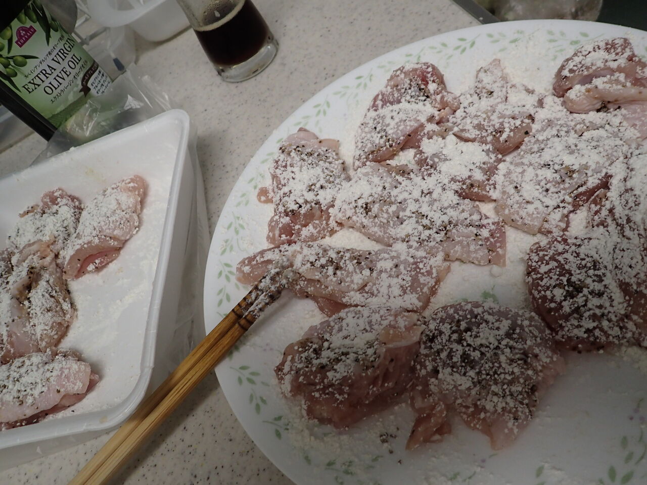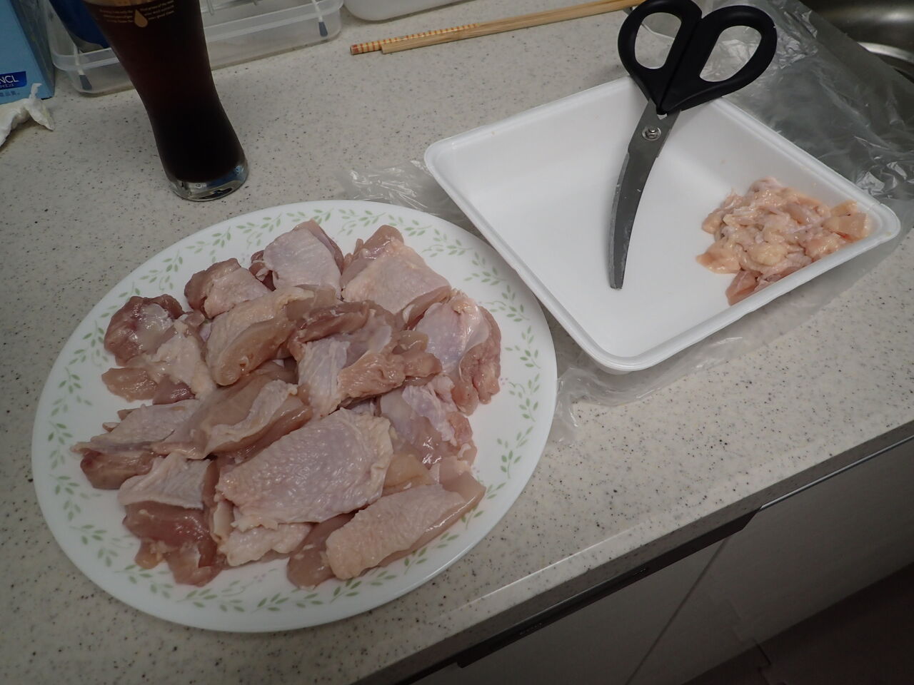 鶏もも肉の皮は残して、脂と筋だけ取り除き(ちと手間がかかりますが、ひと手間です)