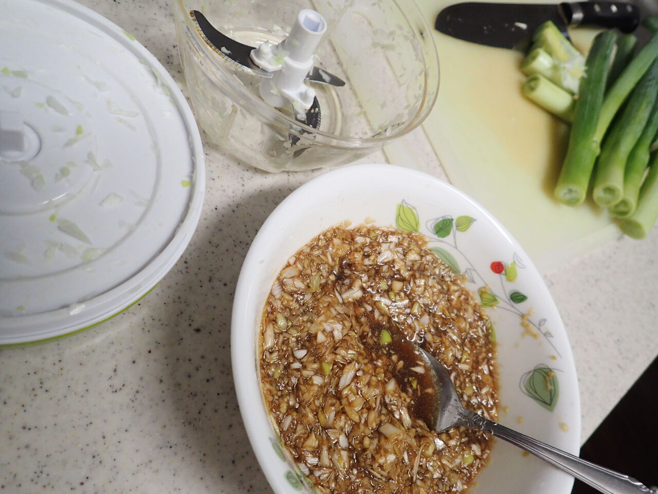 チョッパーでみじん切りにした大量の白ネギに、酢・醤油・砂糖・ごま油で味付けした特製タレをかけたら