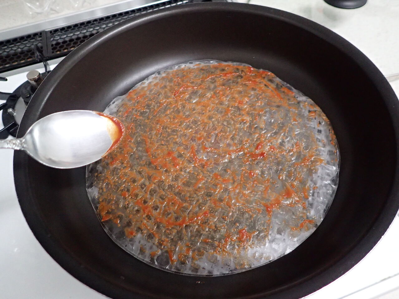 フライパンに乾いたライスペーパーを、その上に水で濡らしたもう1枚を重ね置き