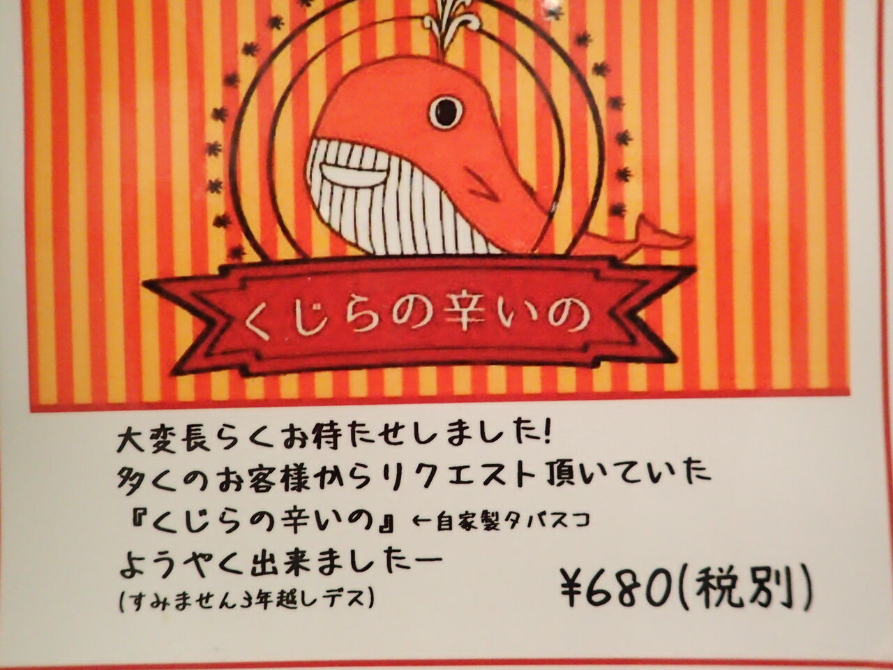くじらさんオリジナルのタバスコなんですけどお料理に添えられいたのがめちゃウマだったんですよ。1瓶あれば結構もつかなと思ったけど、ケチャップに混ぜたりお鍋に使ったりといろんなものにかけまくっていたらあっという間になくなっちゃった何とも言えない奥の深い辛さです