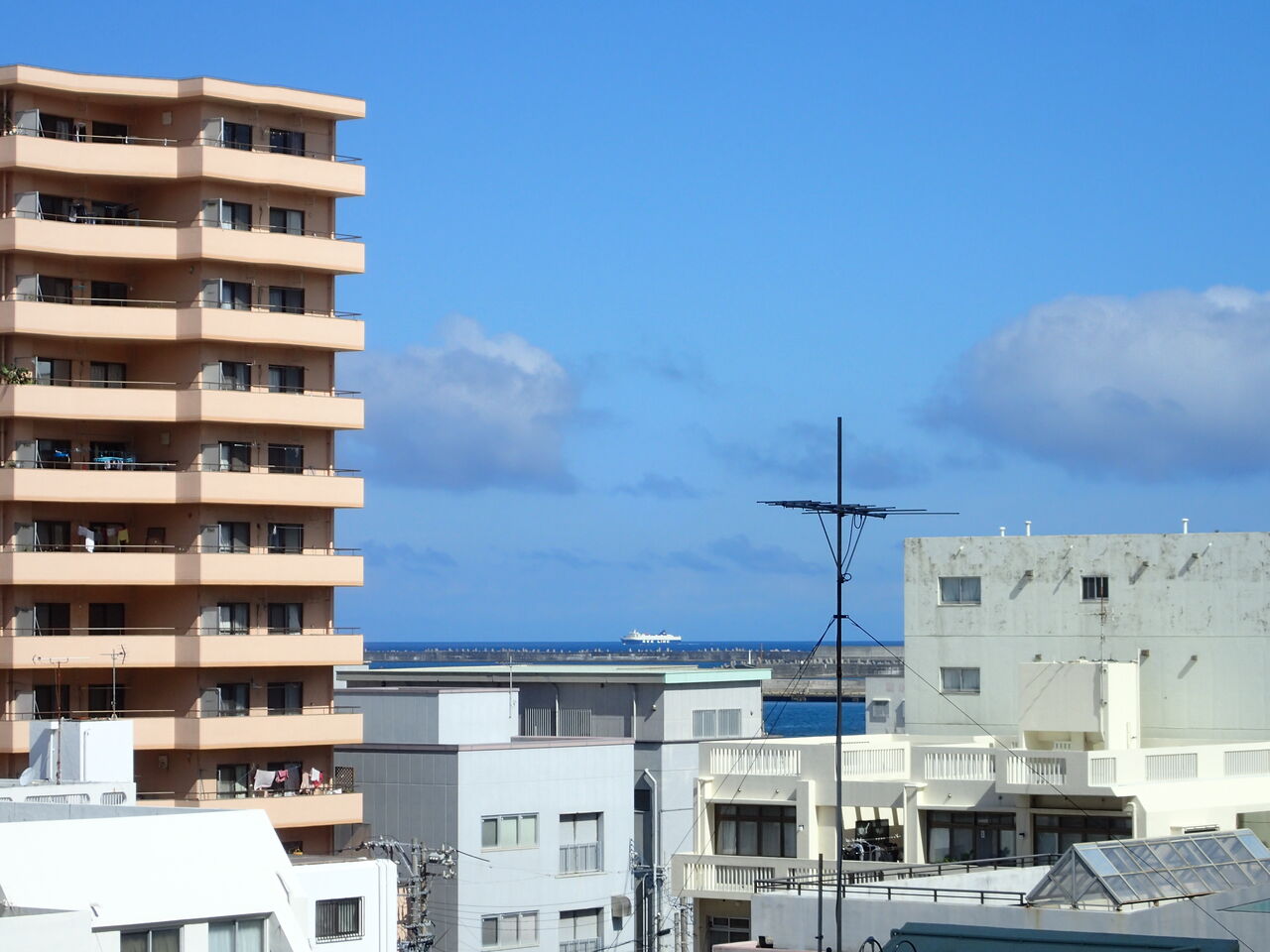 綺麗な青い海、遠くを貨物船?が通ります![]()