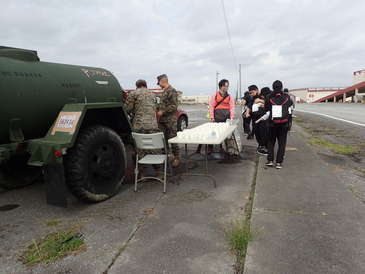 給水所で一旦休憩。お水の入ったカップが並んでいます。