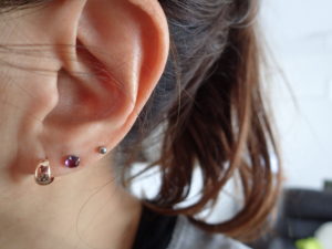Yからはピンクゴールドのフープピアスと紫が綺麗なアメジストのピアス