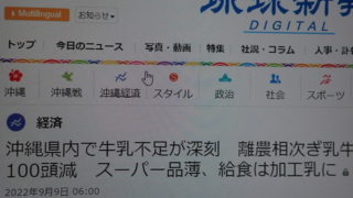 Nのつぶやき毎夏恒例?沖縄の牛乳不足 今日の那覇市26~31℃/湿度63%/北東の風3~7mカラッとしていて快適な暑さ。日陰では風が吹くと涼しく感じるくらいこんにちは、Nです。このところスーパーの棚からたびたび『無調整牛乳』が消えるんです牛乳の消費が多い我が家では無調整牛乳がな... 2022.09.28Nのつぶやき食べ物のこと